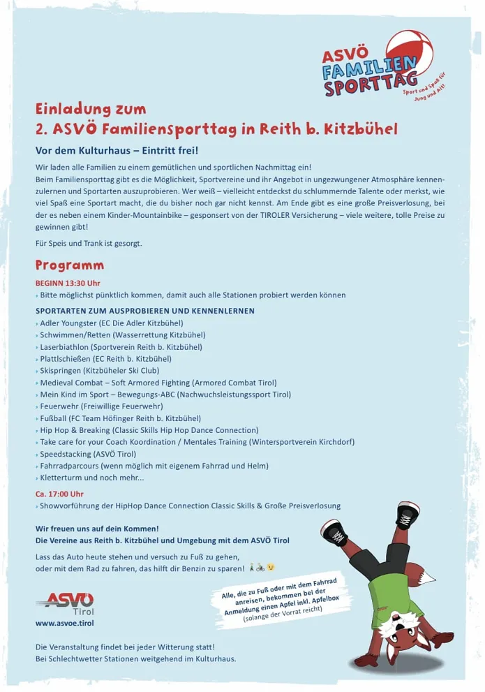 Herzlichen DANK nochmal an die teilnehmenden Vereine: Alle Kontakte zu den Vereinen auf www.asvoe.tirol Projekt Familiensporttag
